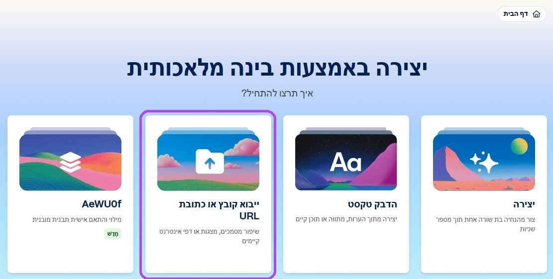 אפשרות זו היא עוצמתית ביותר כי היא מאפשרת לכם לקחת מסמכים קיימים כמו מאמרים, תכניות, ספרים, חוברות הדרכה, דו"חות, פרויקטים ועוד, או דפי אינטרנט – כן – ממש כל מאמר או מידע שמצאתם באינטרנט, ולהפוך אותו תוך מספר שניות למצגת מרהיבה, פשוט על ידי העלאת הקובץ (במקרה של קובץ) או הדבקת הקישור (במקרה של דף אינטרנט).